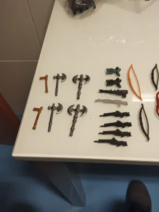 Conjunto de armas y accesorios para figuras Playmobil.57unidades - Variedad de espadas, sables y dagas. - Rifles y pistolas. - Arcos y flechas. - Hachas. - Escudos y cascos.