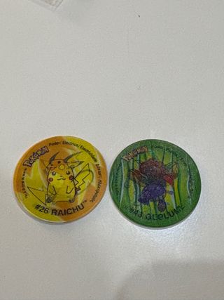 Conjunto de dos tazos de Pokémon. - Tazo #26 Raichu, poder eléctrico. - Tazo #43 Geodude.