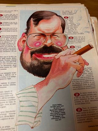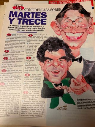 Ficha de la revista de los años 90 con una caricatura . Incluye 25 datos sobre su vida y carrera. Se incluye lista de todos los personajes. Seccion 25 confidencias de la revista Supertele Más de 150 personajes - Caricatura a color. - Información biográfica y profesional. - Formato de ficha de revista.