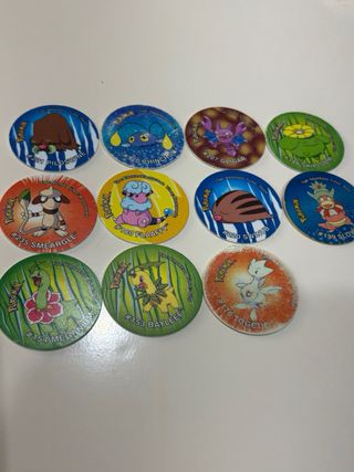 Colección de 9 tazos de Pokémon de la serie hispanogriega. Pregunta por tus faltas!! - Incluye tazos de Venonat, Pikachu, Gastly, Growlithe, Paras, Nidoran, Sandshrew, Tentacool y Ekans. - Diseños variados con personajes icónicos de Pokémon.