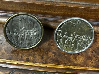 Par de medallones con un diseño detallado de una escena religiosa. - Metal ligero . uno mas plateado y otro mas dorado. - Presentan figuras vestidas con túnicas y un obispo.