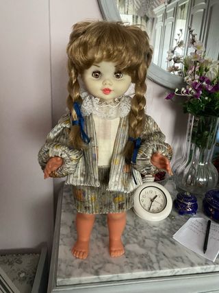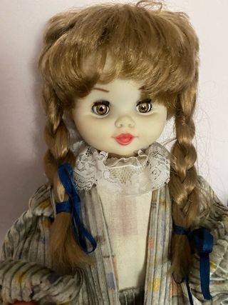 Esta muñeca antigua es una pieza de colección con un diseño encantador. - Vestido a cuadros con chaqueta. - Pelo rubio recogido en coletas. - Detalles de encaje en el cuello.lleva traje chaqueta y falda blusa mide alto 47cm