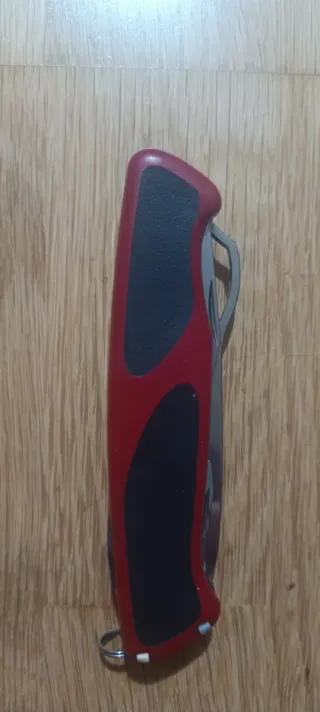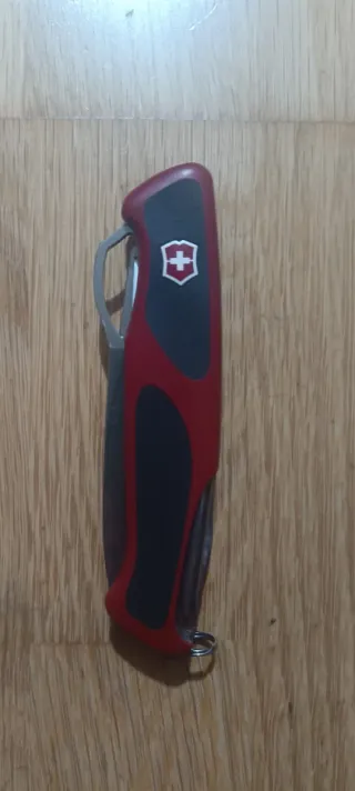 Navaja Victorinox Ranger Grip 78 con mango ergonómico bicolor. - Mango de color rojo y negro. - Hoja principal con muesca para apertura, el abrelatas está repasado para cortar cuerda, bridas etc como se ve en la foto, en muy buen estado.