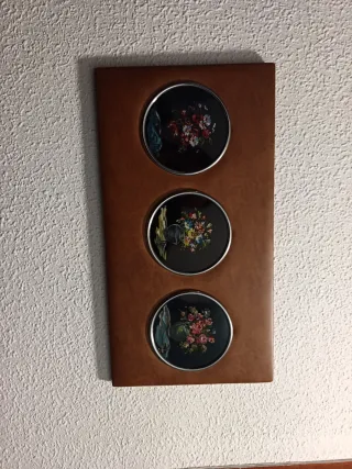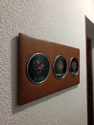 Bonito cuadro decorativo con un diseño vintage. - Base de cuero marrón. - Tres círculos con motivos florales.