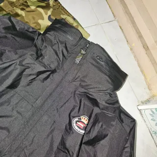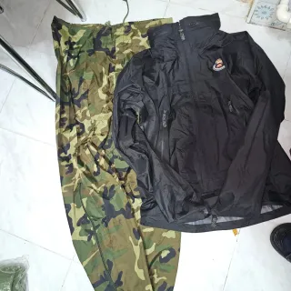 abrigo para protegerte de la lluvia y el viento. Incluye una chaqueta impermeable y un pantalón. - Chaqueta negra con capucha. - Pantalón de camuflaje.