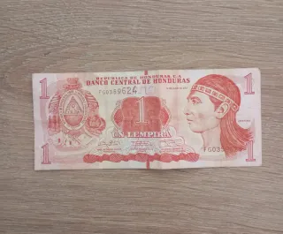 Billete de 1 Lempira de Honduras, emitido en 2014. En buen estado, con señales normales de uso. - Banco Central de Honduras. - Serie FG0359624. - Fecha de emisión: 12 de junio de 2014. - Diseño conmemorativo con Lempira.