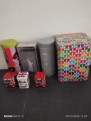 Conjunto de latas metálicas con diversos diseños. Son ideales para almacenar objetos pequeños o como elementos decorativos. Son 7 latas se venden todas juntas por 10€