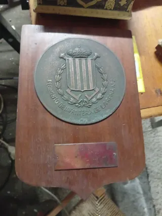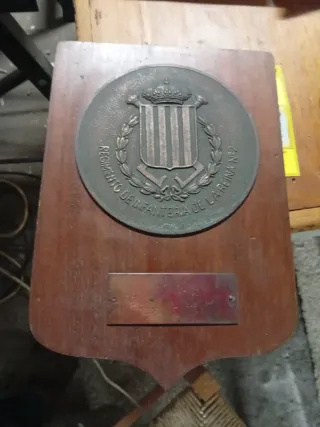 Metopa conmemorativa del Regimiento de Infantería de la Reina Nº2. - Placa circular de bronce con escudo y corona. - Inscripción en el borde: Regimiento de Infantería de la Reina Nº2. - Base de madera con forma de escudo. - Placa metálica rectangular en la parte inferior.