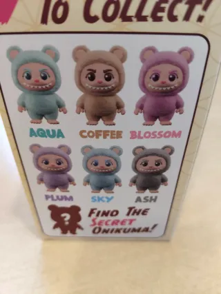 Colección de 9 figuras Onikuma. - Incluye las figuras: Aqua, Coffee, Blossom, Plum, Sky, Ash. - Contiene una figura secreta. - Diseño de osito con capucha.
