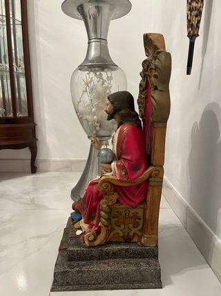 Figura detallada del Sagrado Corazón de Jesús sentado en un trono, sosteniendo el mundo. - Representación religiosa. - Colores vivos en túnica y detalles. - Base texturizada. Medidas: 56 cm alto 25,5cm ancho 25,5cm fondo