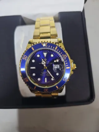 Elegante reloj con acabado en oro y una llamativa esfera azul. Presentado en su caja. - Bisel giratorio azul. - Brazalete de eslabones dorados.