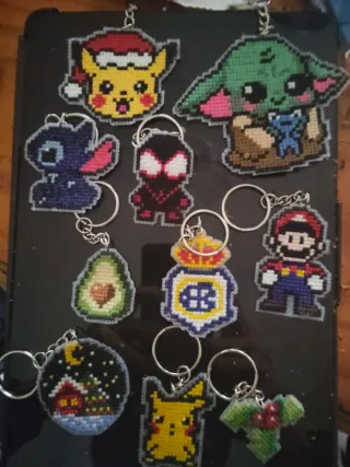 Llaveros únicos hechos a mano con la técnica de punto de cruz. Cada pieza es un pequeño detalle artesanal. - Diseños variados inspirados en videojuegos y escudos. - Materiales resistentes para el uso diario. - Ideales para personalizar mochilas o llaves. A diferentes precios desde 3 a 10 e dependiendo tamaño