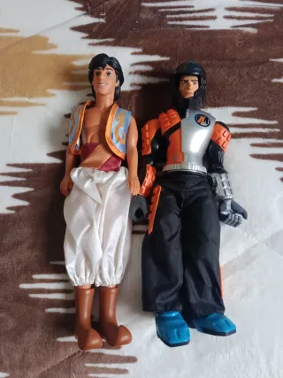 Dos muñecos de acción con vestimenta detallada. - Uno con traje de estilo árabe. - Otro con armadura y casco de piloto.