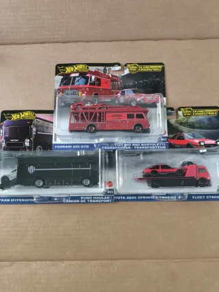 Set de Hot Wheels de la colección Team Transport. - Modelo #83 FIA 642 RN2 Bartoletti Transporter. -Modelo #84 lykan hypersport - Modelo #85 Euro Hauler / Toyota AE86 Sprinter Trueno.
