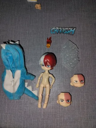 Figura de acción del personaje Todoroki de My Hero Academia. - Incluye cuerpo de figura, dos caras intercambiables y accesorios. - Traje de dinosaurio azul. - Efectos de fuego y hielo.
