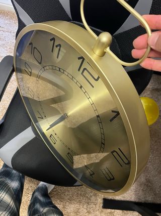 Elegante reloj de pared con un acabado metálico dorado y números grandes para una fácil lectura. Su diseño moderno lo hace ideal para cualquier espacio. - Diseño circular. - Marco metálico dorado. - Números arábigos grandes.