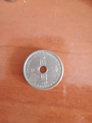 Moneda antigua con un diseño clásico y un agujero en el centro. - Diseño con inscripciones. - Material metálico.