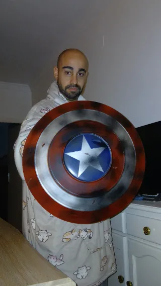 Réplica del icónico escudo del Capitán América. - Diseño circular con estrella central. - Bordes en color rojo y plateado.