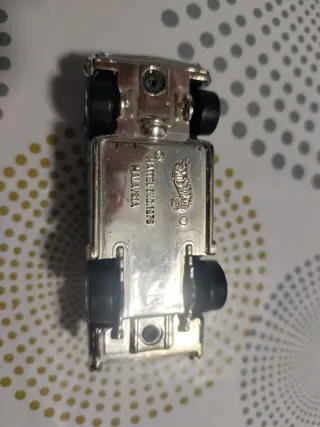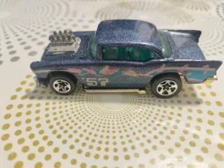 Coche de juguete Hot Wheels modelo Chevy '57 ,1976 Malaysia,Mattel. - Color azul brillante con detalles gráficos. - Diseño tipo dragster con motor expuesto.