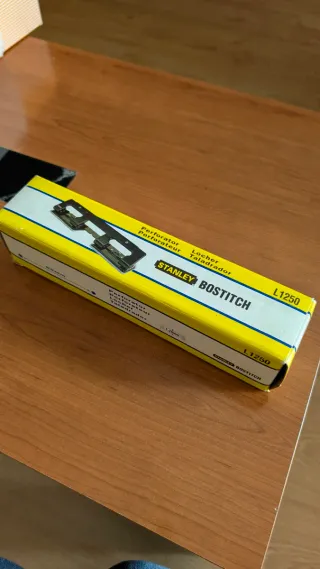 Perforadora de 4 agujeros de la marca Stanley Bostitch, modelo L1250. Ideal para organizar documentos. - Color: Negro y amarillo. - Material: Metal y plástico. - Completamente nuevo y en su caja original