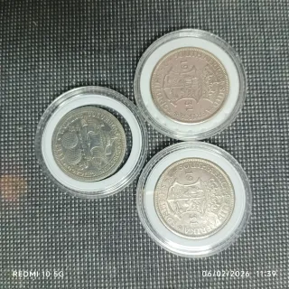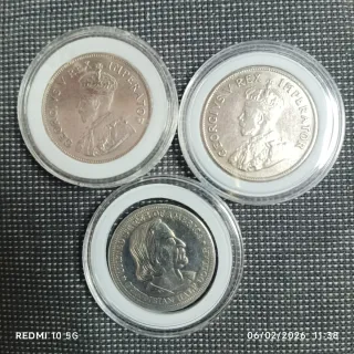 Conjunto de tres monedas de colección. - Dos monedas con el retrato de Jorge V, Rex Imperator. - Una moneda de Estados Unidos de América, Columbian Half Dollar.