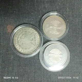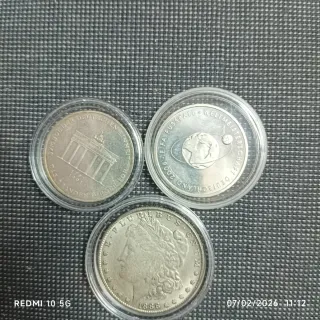 Conjunto de tres monedas de colección. - Una moneda conmemorativa del Muro de Berlín Símbolo de la Unidad Alemana. - Una moneda de la Copa Mundial de la FIFA Alemania 2006. - Una moneda tipo Morgan Dollar con el año 1888.