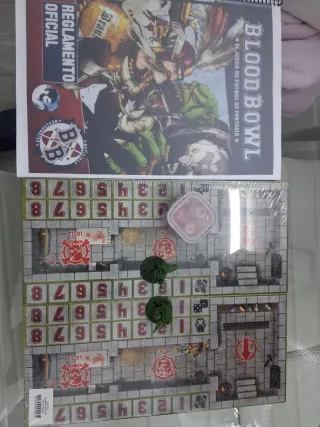 Vendo tablero de bloodbowl nuevo sin desprecintar más dados de juego sin abrir así cómo un par de árbitros, elfo y enano. De regalo el reglamento impreso.
