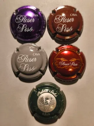 Conjunto de cinco chapas de cava, cada una con un diseño único. - Cava Maria Oliver Porti - Cava Puig Amat - Cava Monegal Sarda - Cava Quod Libet - Cava Cal Damià