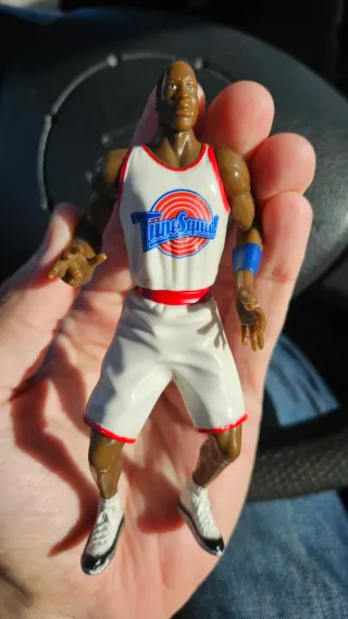 Figura coleccionable de Michael Jordan con el uniforme del Tune Squad de 1996. - Detalle del logo Tune Squad en el pecho. - Uniforme de baloncesto blanco con detalles rojos. - Brazalete azul en el brazo izquierdo. - Zapatillas blancas y negras. - (Falta a pelota)