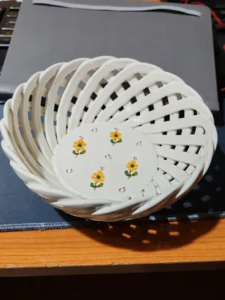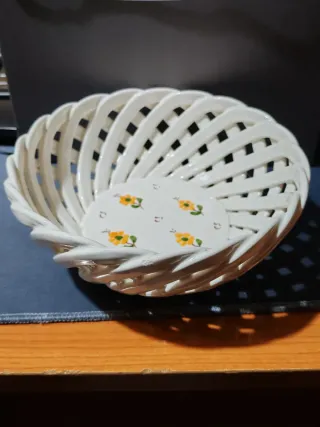 Bonita cesta de cerámica con un diseño calado y decorada con pequeñas flores amarillas. MEDIDAS :7 cm alto 54 cm diámetro - Material: Cerámica. - Diseño calado. - Motivo floral.