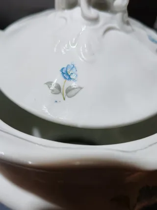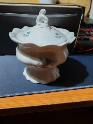 Preciosa pieza de cerámica con un delicado diseño floral. MEDIDAS :18cm con la tapa (10 cm sin ella) 45 cm Diámetro CÓMO BOMBONERA, O AZUCARERA - Acabado brillante. - Detalles en color azul. - Diseño con tapa y base.