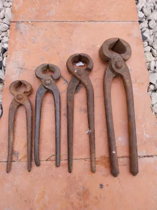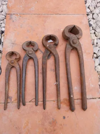 Conjunto de cuatro tenazas antiguas, fabricadas en forja. Presentan un diseño clásico y robusto. - Juego de 4 tenazas. - Material: Metal forjado. - Acabado rústico.