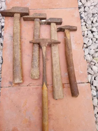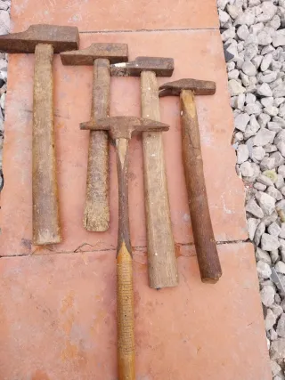 Conjunto de cinco martillos antiguos con mangos de madera. - Mangos de madera. - Cabezas de metal.