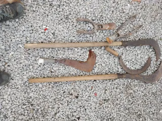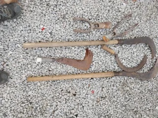 Conjunto de herramientas agrícolas antiguas, ideales para coleccionistas o para uso decorativo. - Incluye hoces y otros aperos. - Mango de madera. - Piezas de metal con aspecto rústico.