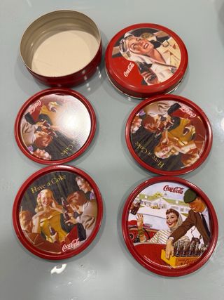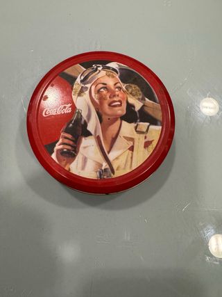 Juego de posavasos con diseño vintage de Coca-Cola. -con su caja metálica - Diseño redondo. - Imagen de aviadora clásica.