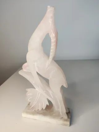 Elegante figura decorativa tallada en piedra, con un diseño delicado y un acabado translúcido. - Material: Piedra (posiblemente cuarzo rosa o similar). - Diseño: Animal estilizado (parece un ciervo o antílope). - Base: Incluye una base de piedra a juego.