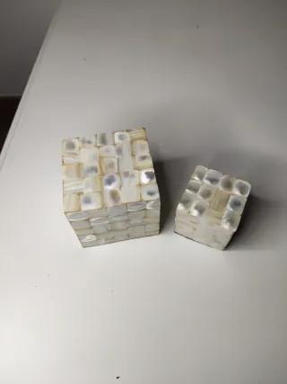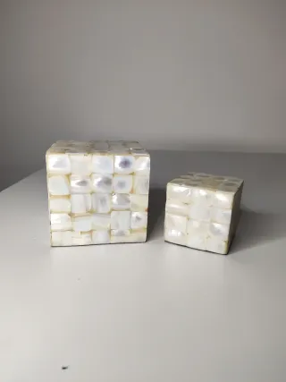 Conjunto de dos figuras decorativas con forma de cubo, elaboradas con incrustaciones de nácar. - Diseño geométrico. - Acabado brillante y nacarado. - Piezas únicas para realzar la decoración.