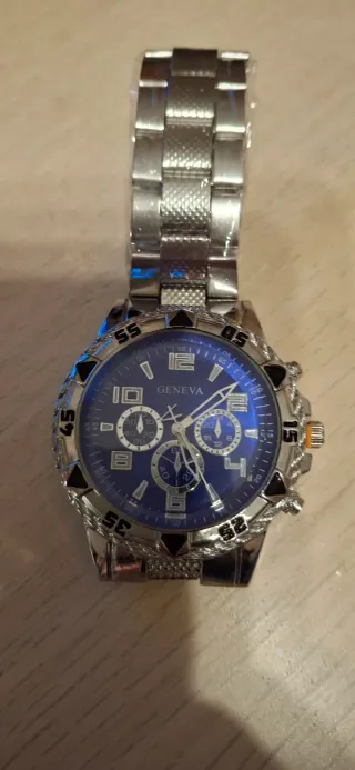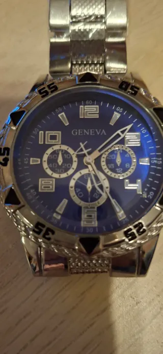 Elegante reloj Geneva con esfera azul y detalles plateados. - Correa de metal plateado. - Bisel con detalles decorativos. - Esfera azul con marcadores plateados.