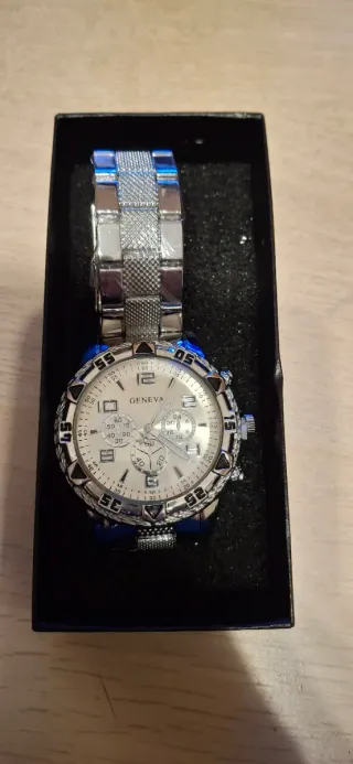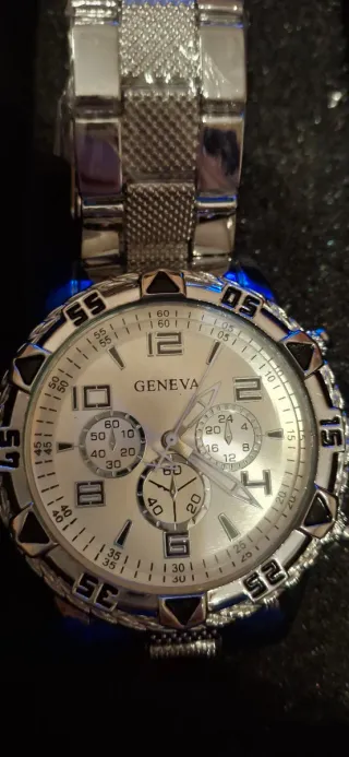 Elegante reloj Geneva con una correa de metal plateado y detalles en azul vibrante. - Esfera blanca con marcadores plateados. - Bisel decorado con detalles metálicos. - Correa de eslabones plateados. Nuevo a estrenar
