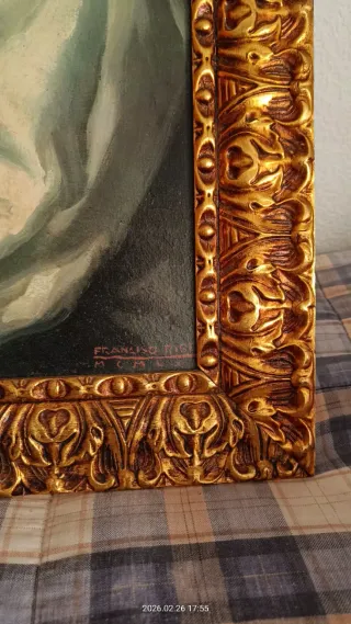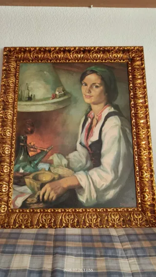 Cuadro al óleo de un bodeguero. La obra representa una escena interior con una figura femenina. - Marco dorado con detalles ornamentales. - Técnica de pintura al óleo.