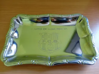 Bandeja - placa conmemorativa del FC Barcelona. Tamaño aproximado 18x12 cm. - Grabado CAMPIÓ DE LLIGA 1984/85. - Escudo del FCB con balón. - Fabricada en alpaca. Puede presentar pequeñas marcas. #barça #fcbarcelona