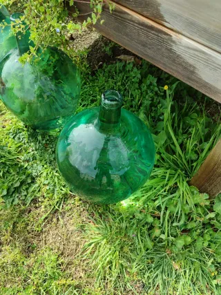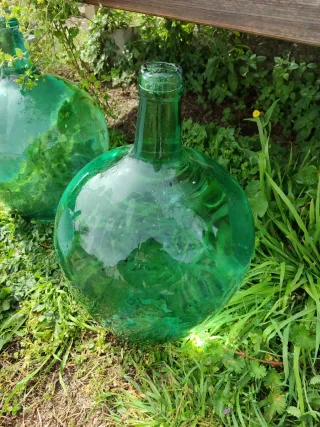 Jarro de vidrio verde con un diseño vintage, perfecto para añadir un toque de estilo a cualquier espacio. - Vidrio de color verde. - Diseño de botella grande y redondeada. - Cuello estrecho.