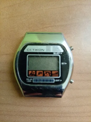 Reloj digital Cetikon de estilo vintage. Presenta un diseño clásico y funcional. - Diseño de caja metálica. - Pantalla digital. - Botones laterales para funciones.