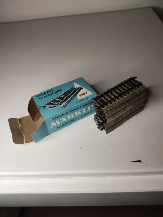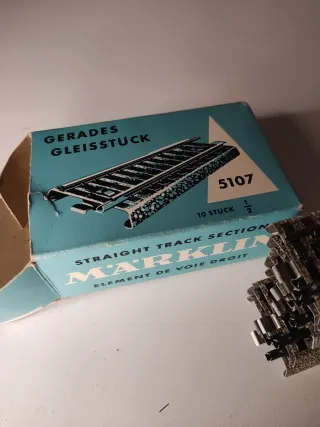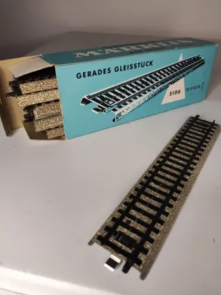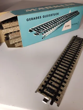 Conjunto de vías rectas para maquetas de tren Märklin en escala H0. El paquete incluye 10 piezas. - Vías rectas para trenes a escala H0. - Marca: Märklin. - Modelo: 5106. - Cantidad: 10 unidades.