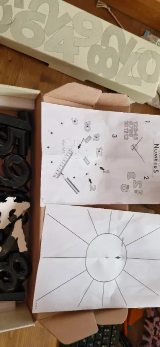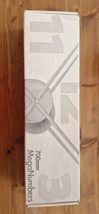 Reloj de pared con un diseño moderno y números grandes en color negro y las agujas plateadas. - Tamaño: 700mm. - Diseño: Mega Números - A pila AA - Los números estan desengachados y se nota la pintura que se ha pegado.