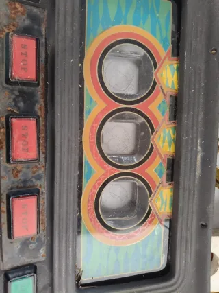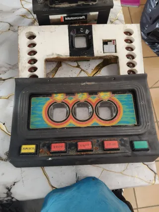 Pieza de máquina tragaperras antigua, con detalles de la marca Motorcraft.para. Recoger. En. Casa - Panel frontal con diseño de tres tragamonedas. - Botones de control: Avance, Stop y Start. - Marco exterior de plástico negro. - Componentes internos visibles.