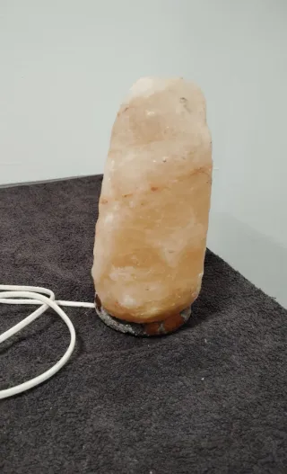Lámpara decorativa hecha de sal del Himalaya. Su base es de madera. - Forma irregular. - Tono anaranjado/rosado. - falta cambiar la bombilla pero si funciona