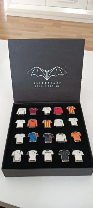 Colección de pins conmemorativos del centenario del Valencia CF. - Diseño de camisetas de fútbol. - Incluye el logo del murciélago y el texto VALENCIA CF 1919 - 2019 ∞.