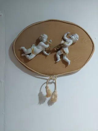 Preciosa pareja de angelitos de porcelana con detalles dorados, montados sobre una base ovalada de madera con borde de cuerda. - Figuras de porcelana blanca. - Detalles en dorado. - Base de madera. - Borde de cuerda decorativa. - Cuelga con borlas de cuerda.