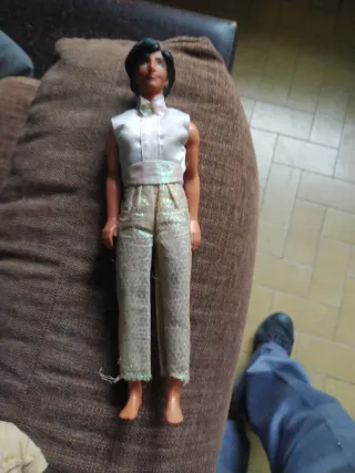 Muñeco del personaje Aladdín de Disney, vestido con su atuendo característico. - Traje blanco y dorado. - Pantalones brillantes. - Cinturón rosa.